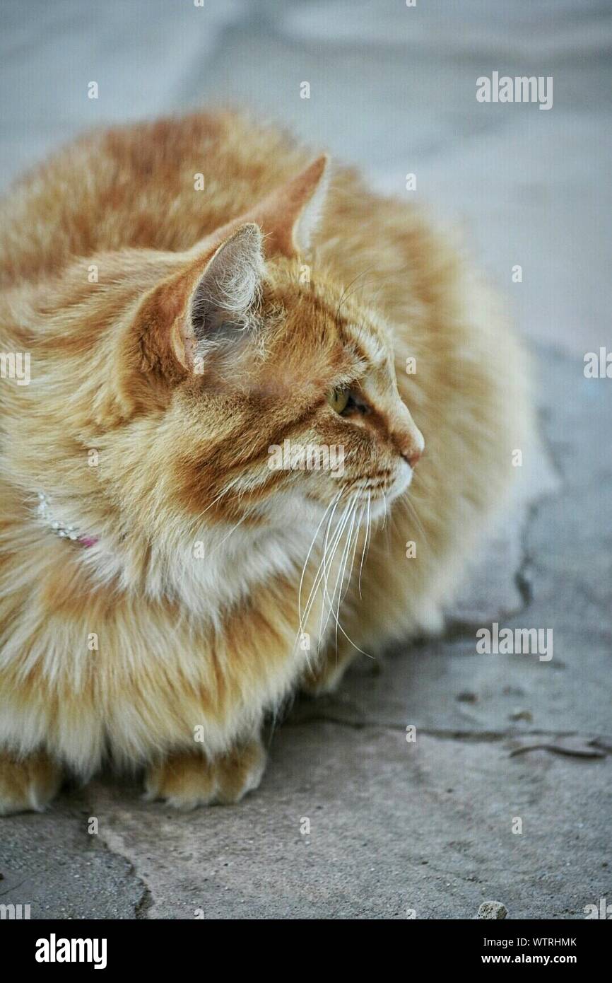 Hairy Ginger Cat Resting On Footpath Stock Photo Alamy